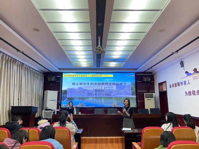 2021年11月30日18:00-20:00,yl6809永利官网第二期“研究生专业教育—教授谈治学”系列讲座在学院一楼学术报告厅成功举办。教育硕士专业学位研究生导师杨金凤老师应邀为yl6809永利官网专业硕士研究生作了题为“硕士研究生的卓越教师发展与学习”的专题讲座。杨金凤老师为新疆生产建设兵团教育学会化学教学专业委员会常务理事、中国科技馆科普讲师团团员。本次讲座采取线上线下结合的形式举办,由学院研究生管理与学科建设办公室主任范树花老师主持,范老师代表学院对杨金凤副教授带来讲座表示感谢,并对杨副教授在教学、科研及人才培养等方面的成果作了介绍。