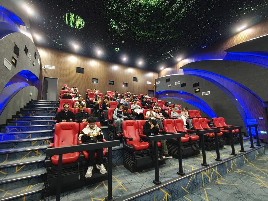 科技馆充满科幻感的装饰及互动项目瞬间吸引了同学们的目光。同学们以“准教师”与“探究者”的双重身份,跟随科技馆讲解员深入各展区。首站打卡5D影院,大家有序佩戴好特制偏振眼镜,落座于可同步联动的动感座椅。随着影片启动,座椅的起伏震颤、四周喷出的模拟水汽与阵阵微风精准配合画面,将大家瞬间“传送”至恐龙漫步的史前丛林。当巨大的霸王龙从屏幕中“冲出”时,逼真的视觉冲击与多感官联动体验,让在场同学纷纷发出惊叹:“科技的神奇不再是书本上的概念,而是能亲身触摸到的鲜活体验。”
